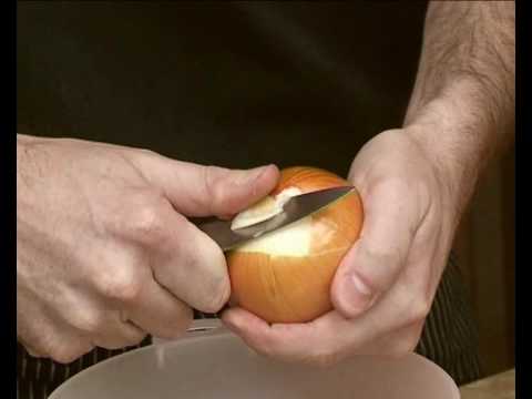 Culinary trainer Bruno Casassus from The French Culinary School in Asia demonstrates how to peel and slice onions.